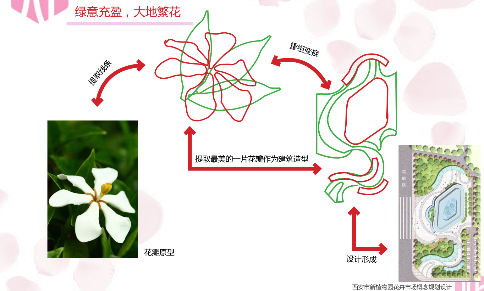 設(shè)計理念:以新植物園為依托,打造集物流零售、教育科研、觀光旅游為一體的新型花卉市場。整個場地及建筑的造型來自于花瓣的抽象延展,將鋪裝與花瓣的形象相融合,緊貼主題,打造首個集物流、教育、觀光、展示、售賣為一體的花卉市場。